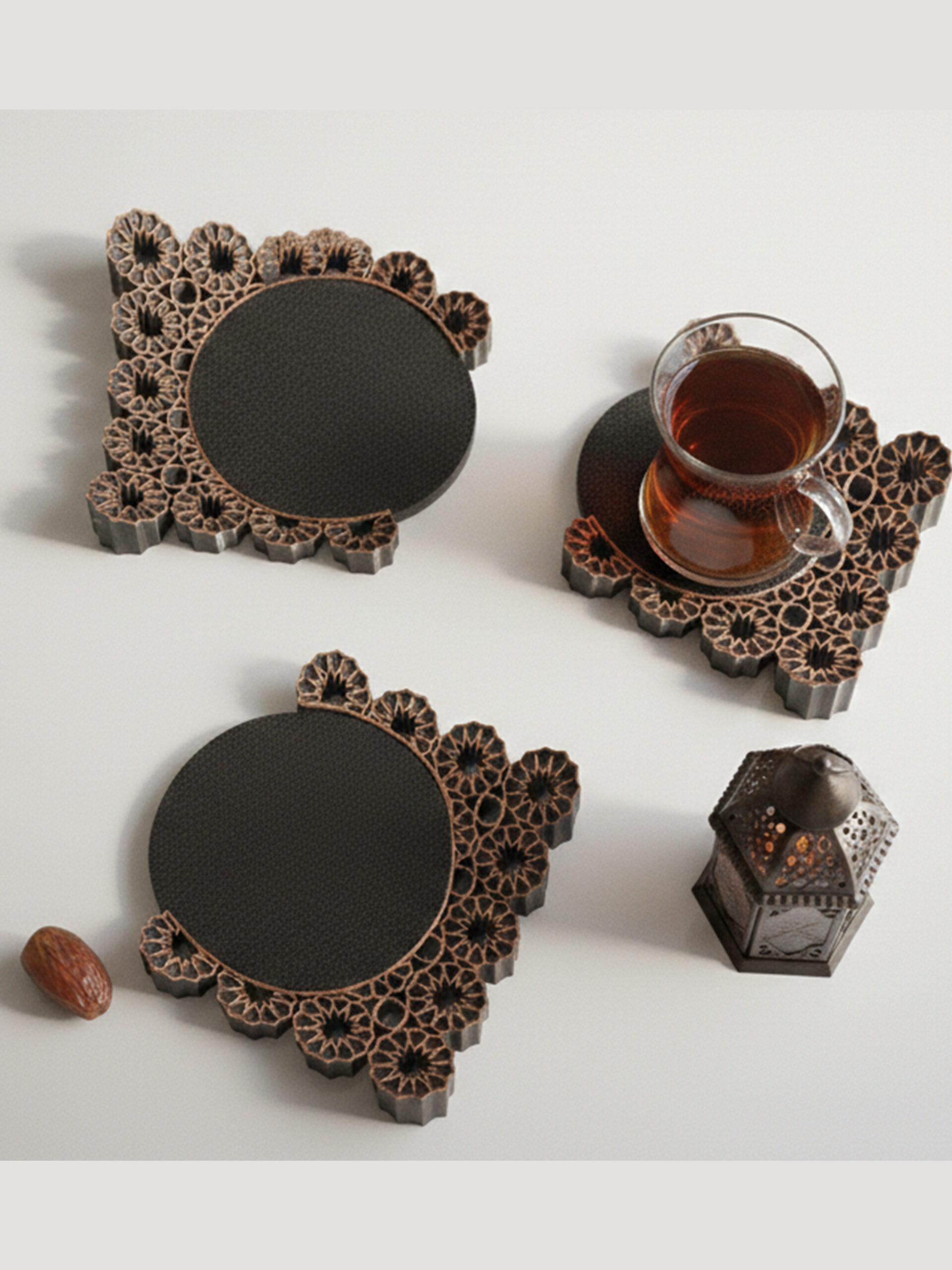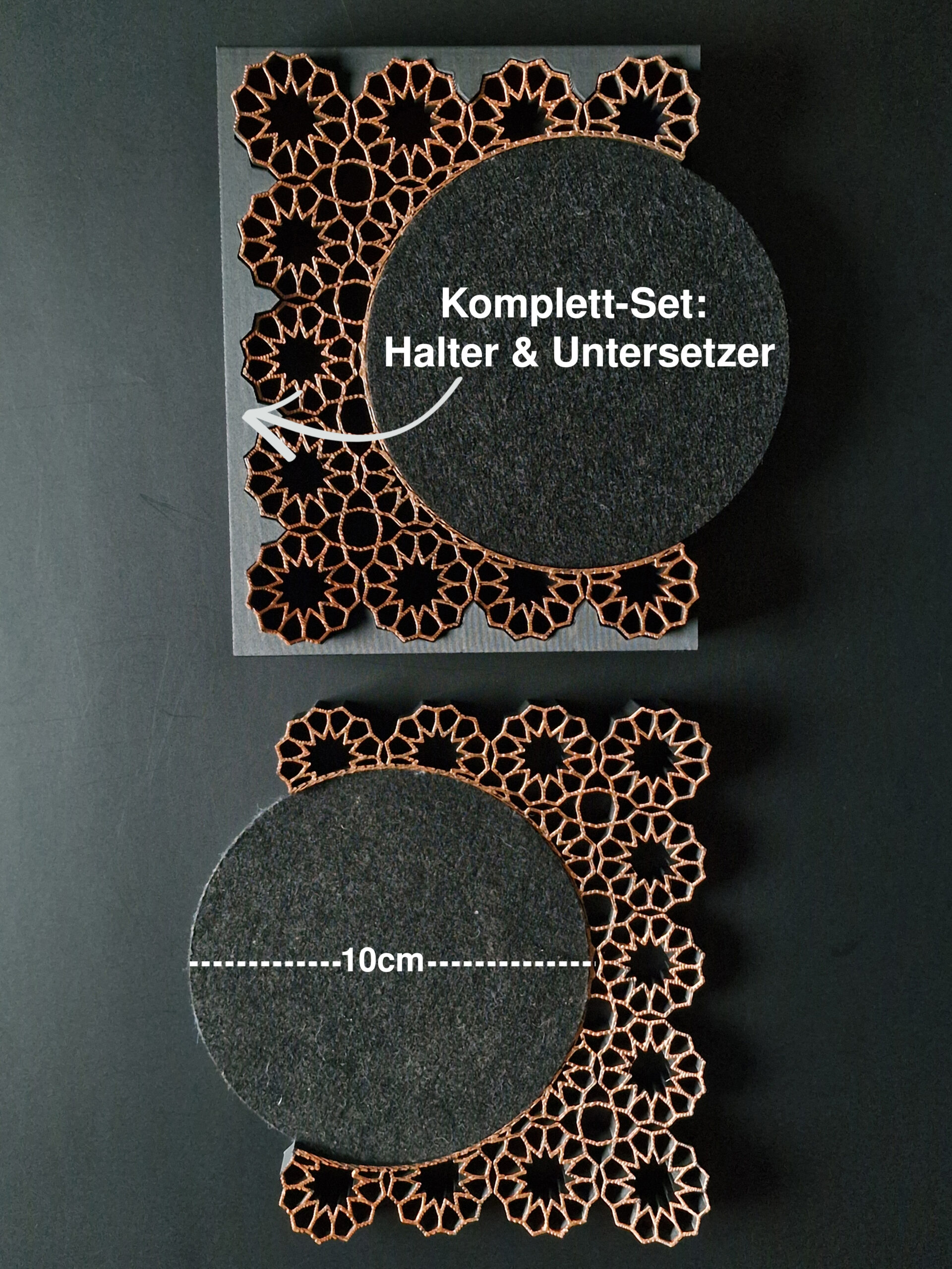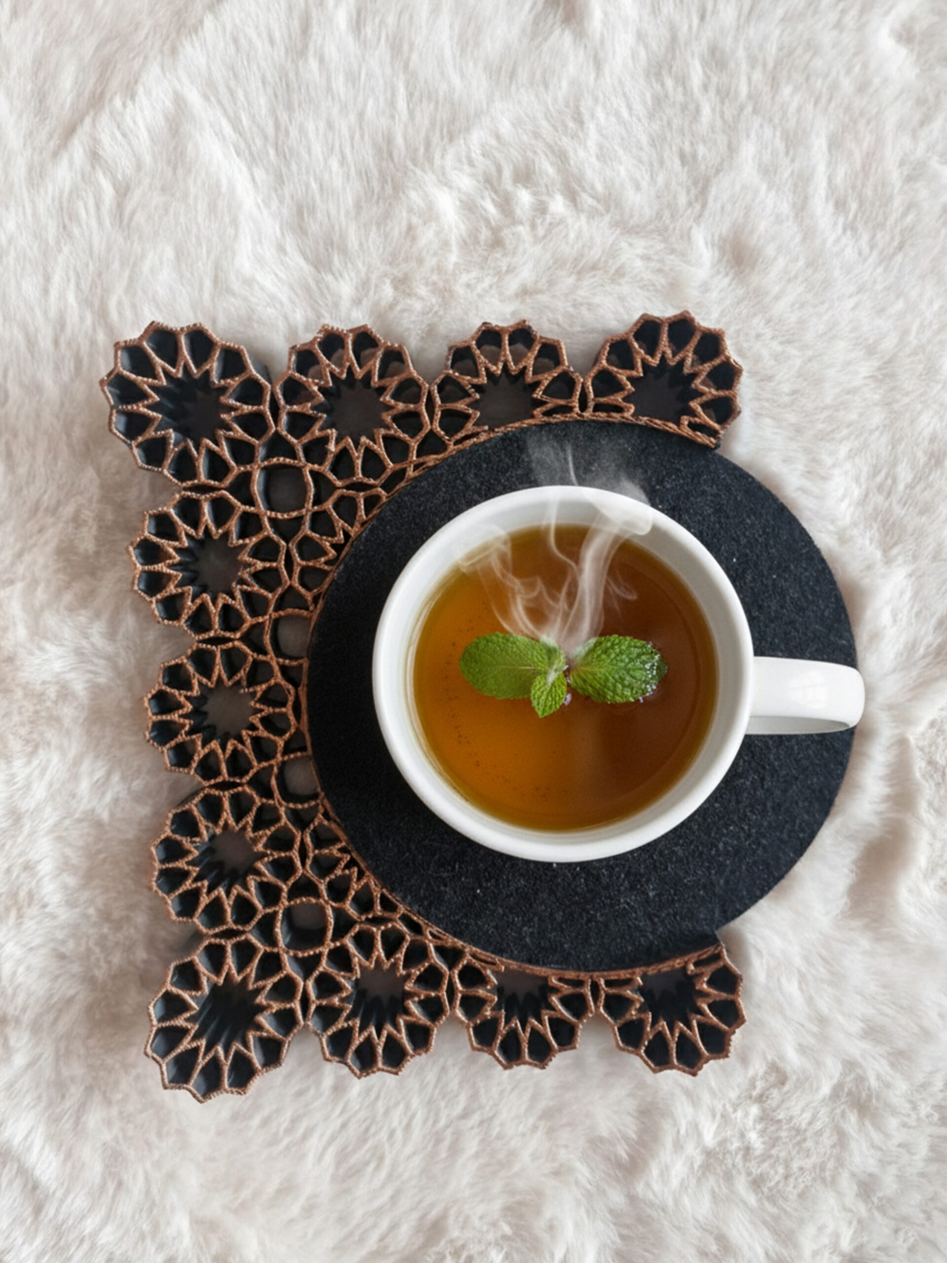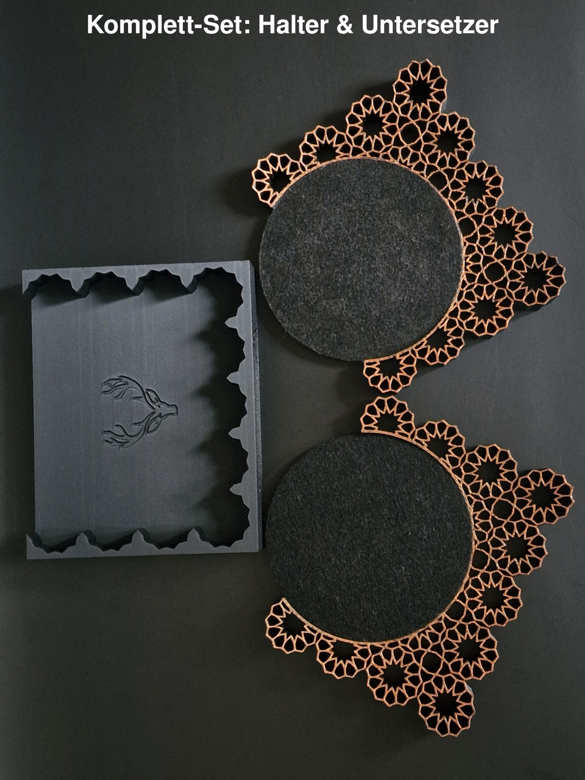 Tauchen Sie Ihr Zuhause in die Wärme des zeitlosen orientalischen Erbes ein. Dieses Set ist mehr als nur ein Untersetzer; es ist eine Hommage an die feine Kunstfertigkeit. Es wurde entworfen, um die faszinierende Schönheit geometrischer Muster und die Seele orientalischer Gastfreundschaft in jeden Wohnraum zu bringen. Ob für spirituelle Zusammenkünfte oder aus Liebe zur globalen Kunst – diese Stücke verleihen Ihrem Tisch einen Hauch von anspruchsvoller Geschichte.