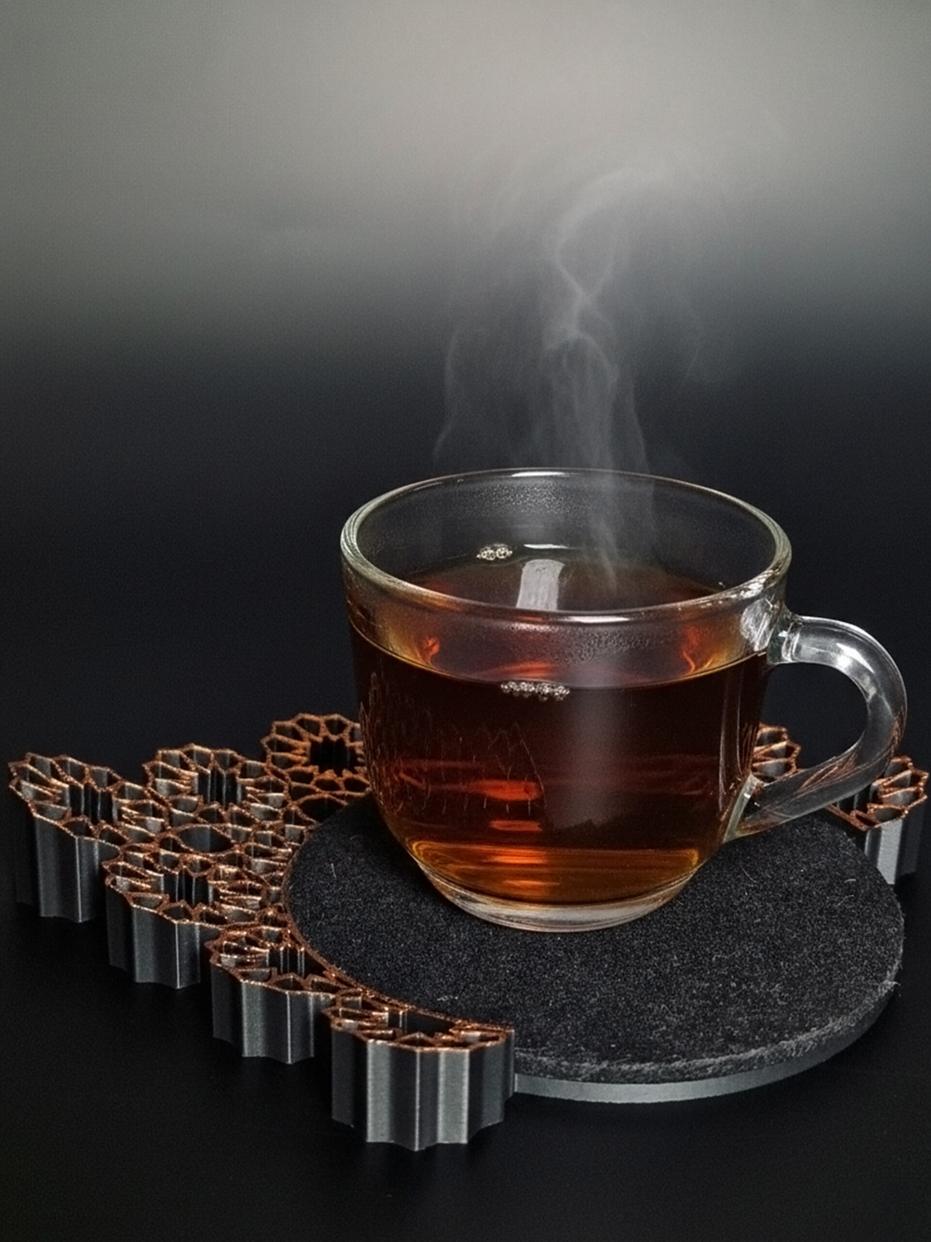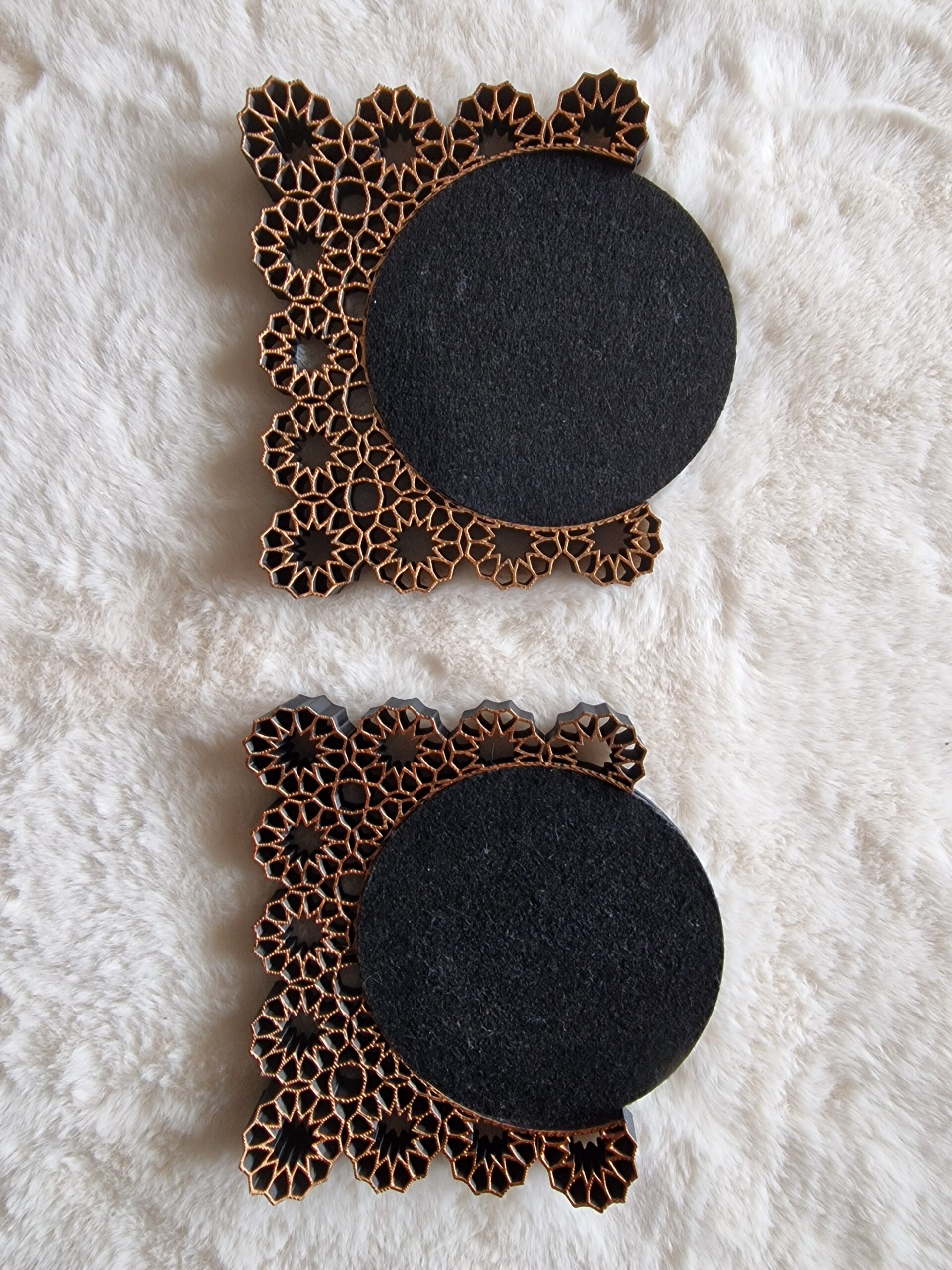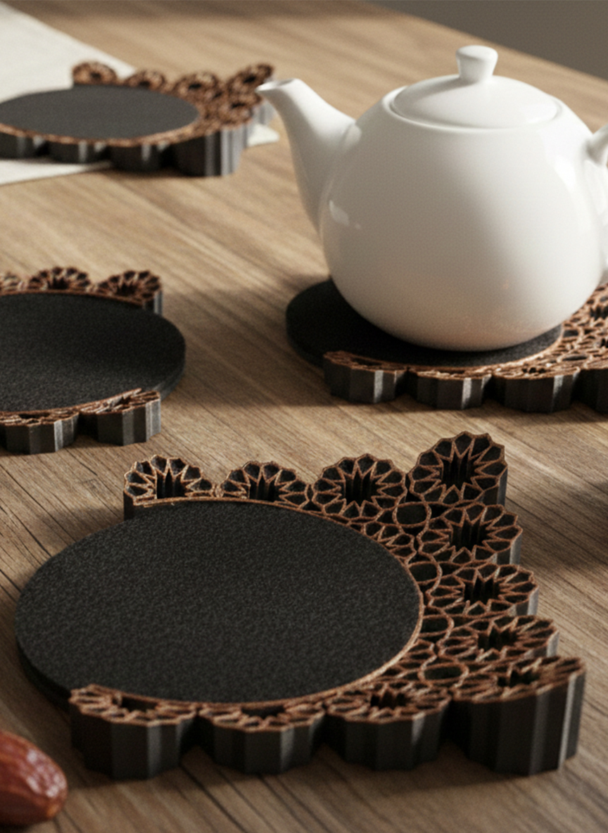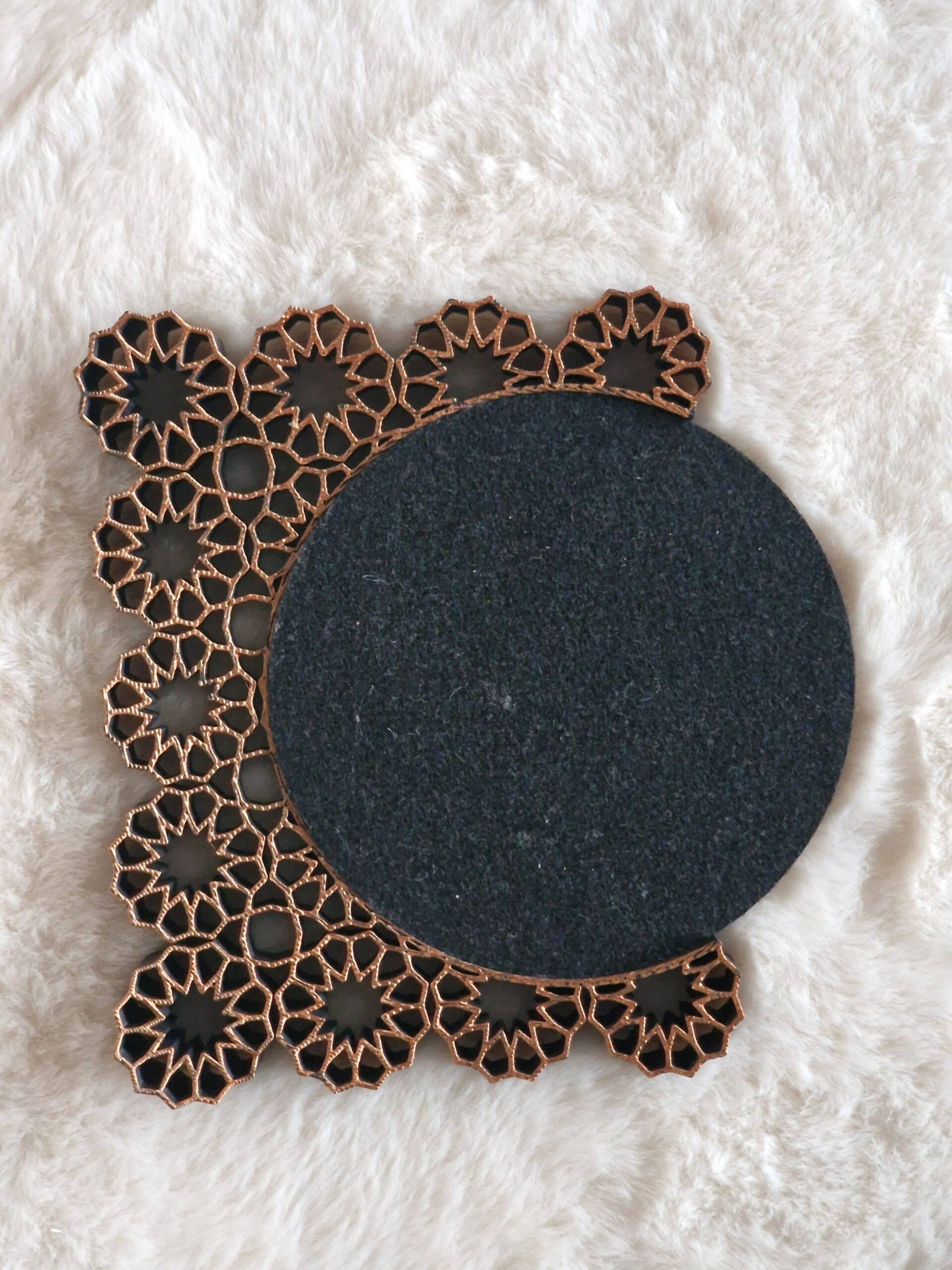 Tauchen Sie Ihr Zuhause in die Wärme des zeitlosen orientalischen Erbes ein. Dieses Set ist mehr als nur ein Untersetzer; es ist eine Hommage an die feine Kunstfertigkeit. Es wurde entworfen, um die faszinierende Schönheit geometrischer Muster und die Seele orientalischer Gastfreundschaft in jeden Wohnraum zu bringen. Ob für spirituelle Zusammenkünfte oder aus Liebe zur globalen Kunst – diese Stücke verleihen Ihrem Tisch einen Hauch von anspruchsvoller Geschichte.